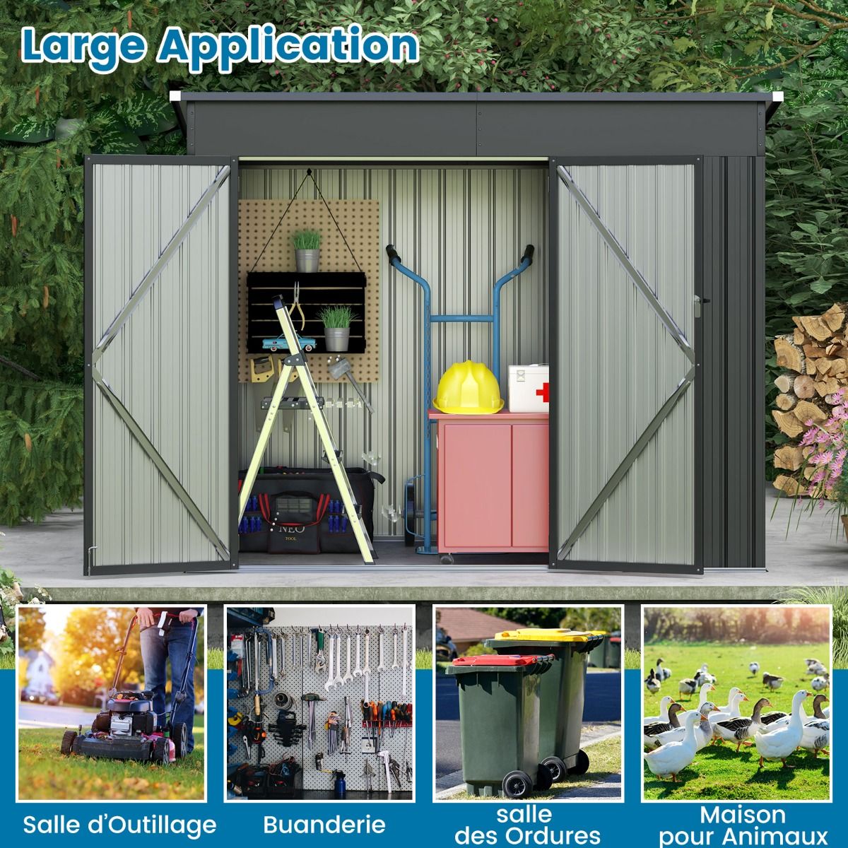 Abri de Jardin Extérieur Abri à Outils de Jardin avec 2 Portes Design Incliné Aérations Cadre en Métal Galvanisé 235x117x185cm Gris Foncé