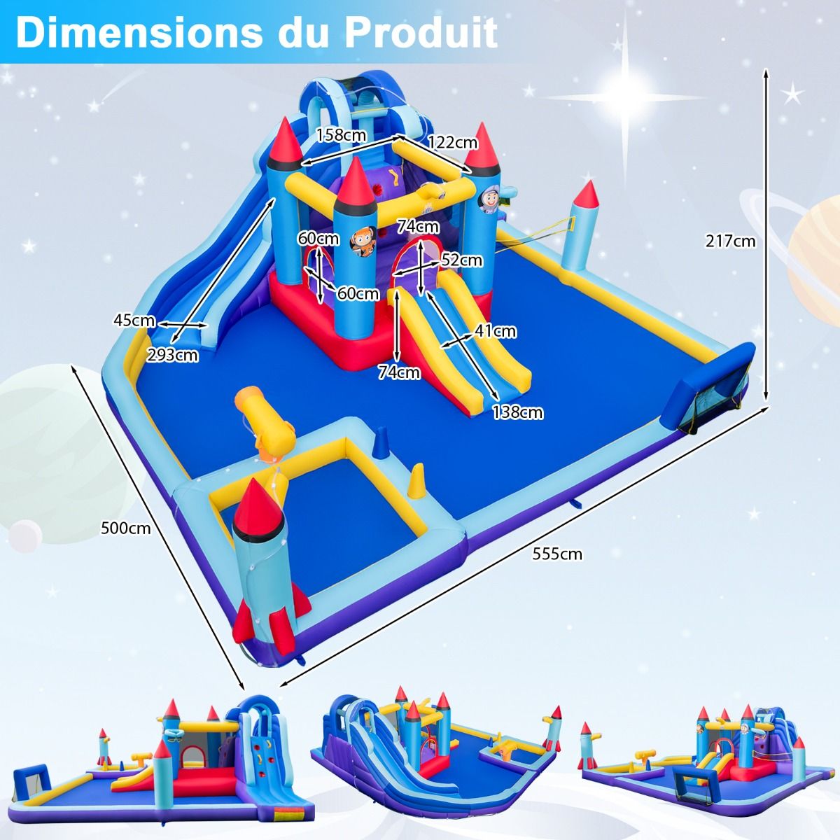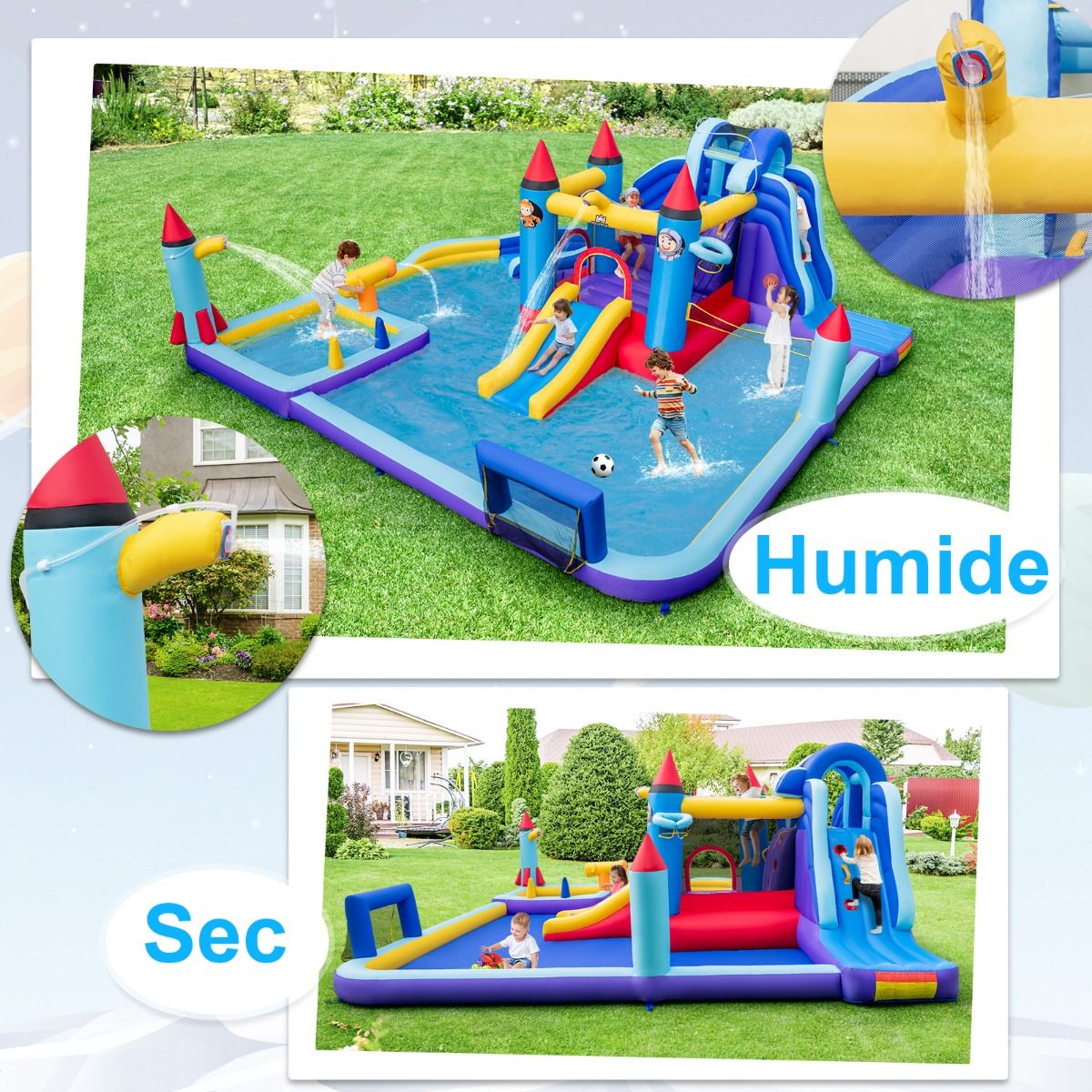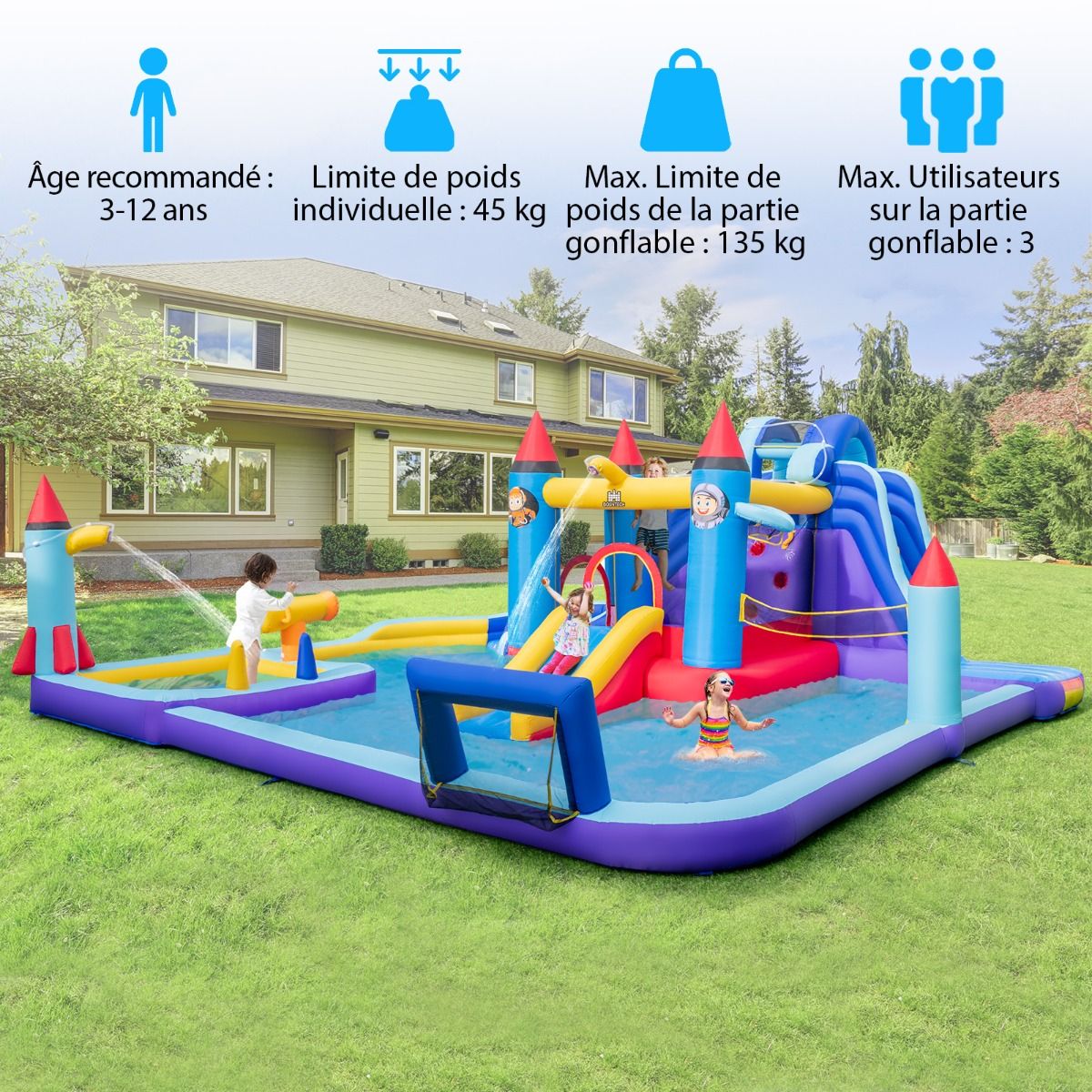 Château Gonflable à Toboggans Aquatiques Thème de La Fusée pour Enfants Piscine Zone de Saut Pistolet à Eau Escalade Souffleur de 850 W Multicolore