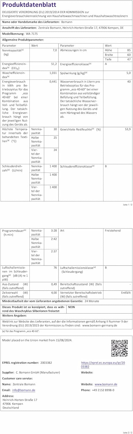 Bomann Machine à laver | 7kg | max 1400 tours | Garantie moteur 10 ans | Moteur inverter efficace, silencieux et durable | 15 programmes | Présélection du temps de fin | Affichage LED | Machine à