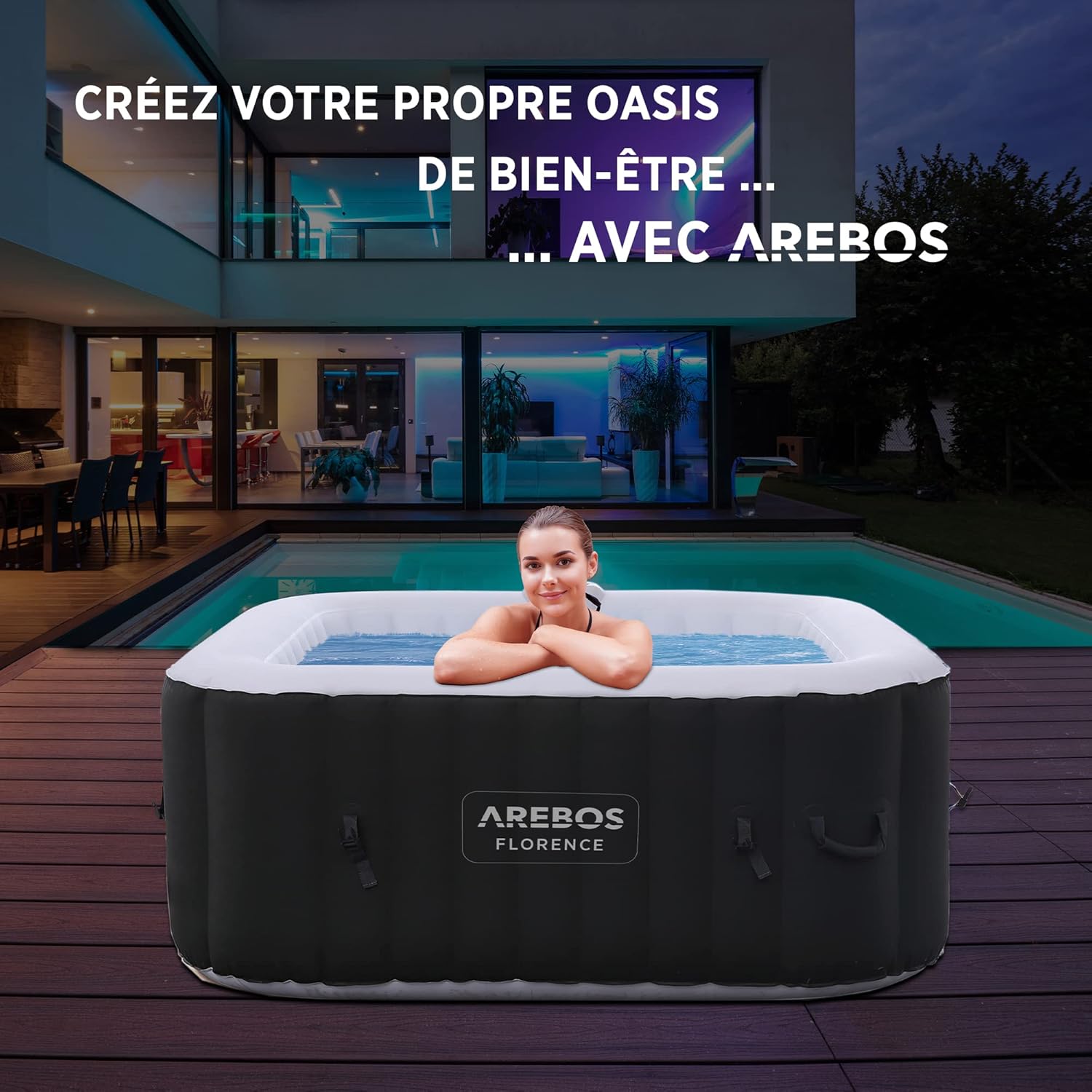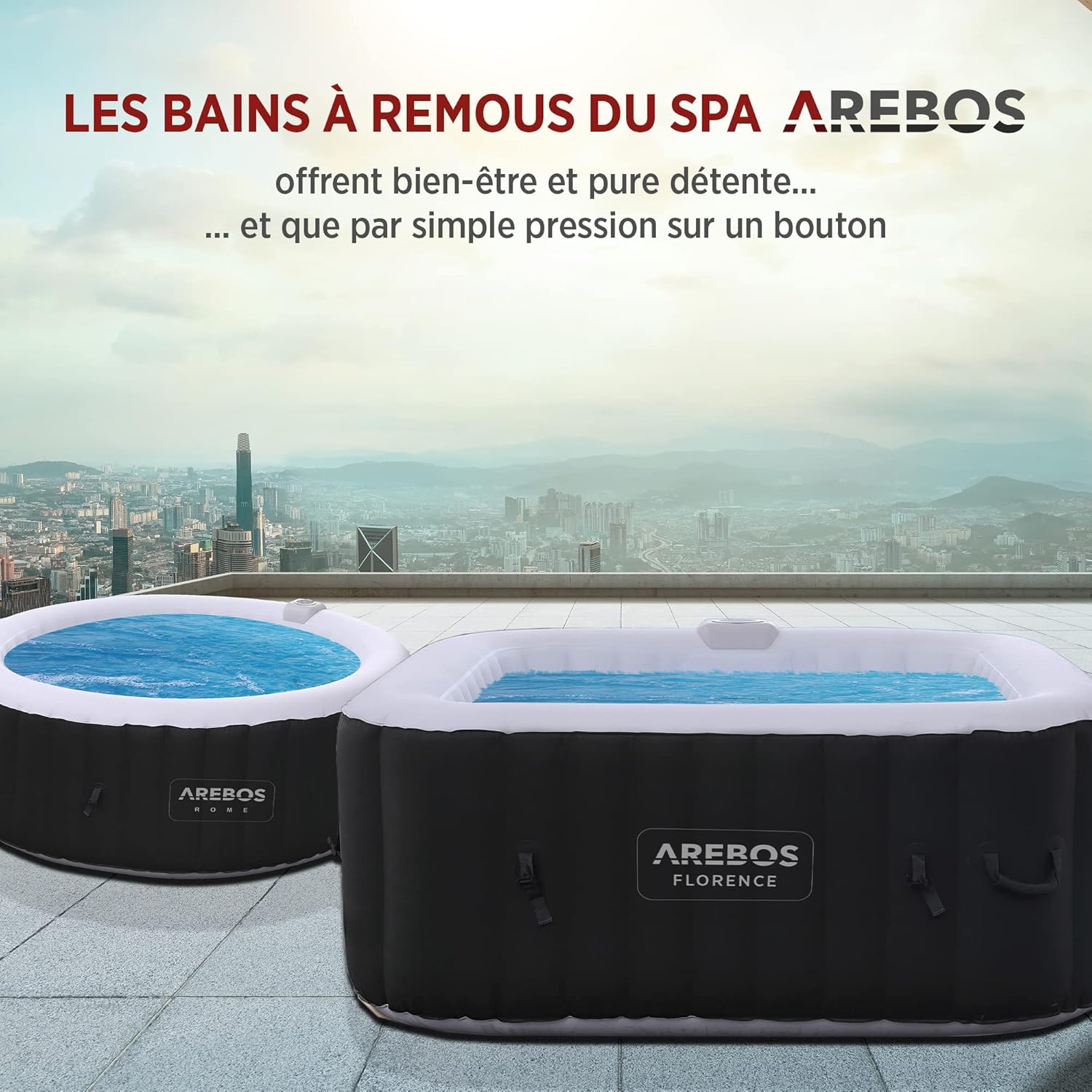Arebos Spa Gonflable | pour l'intérieur et l'extérieur | 4 Personnes | 154x154cm | 100 Jets de Massage | Spa Bien-être Chauffage | Massage Gonflable Carré | 600 litres